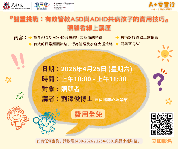 『雙重挑戰:有效管教ASD與ADHD共病孩子的實用技巧』照顧者線上講座 日期︰2026/4/25