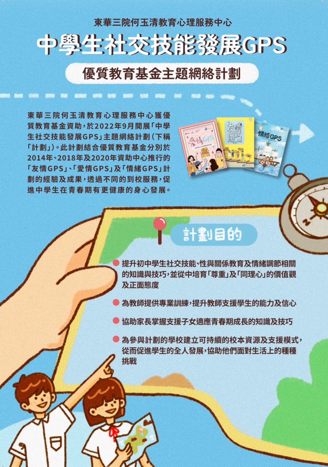東華三院何玉清教育心理服務中心獲優質教育基金 (QEF) 資助,推行 「中學生社交技能發展 GPS 計劃」。我們期望透過多元化的介入,與學校攜手支援學生的成長發展。