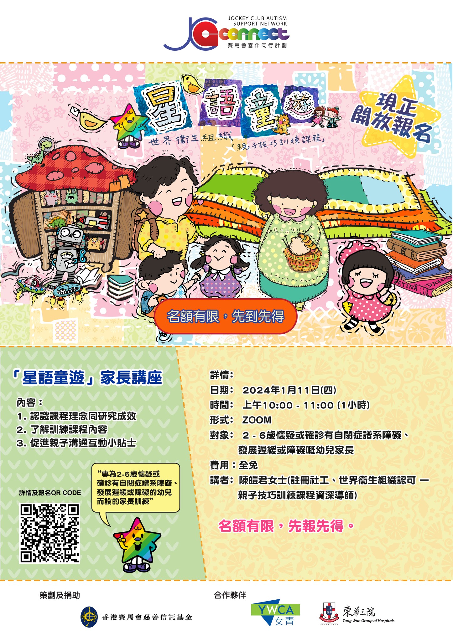 「星語童遊」世界衞生組織親子技巧訓練課程為本港首個專為2-6歲懷疑或確診有自閉症譜系障礙、 發展遲緩或障礙的幼兒而設的照顧者訓練。我們誠意邀請你參與是次家長講座,以了解更多課程內容, 包括如何吸引孩子關注你的十大招數。課程能夠有助你和孩子有效溝通之餘, 亦可以在過程中提升佢們的溝通表達和做事的靈活性,令你與孩子攜手成長。