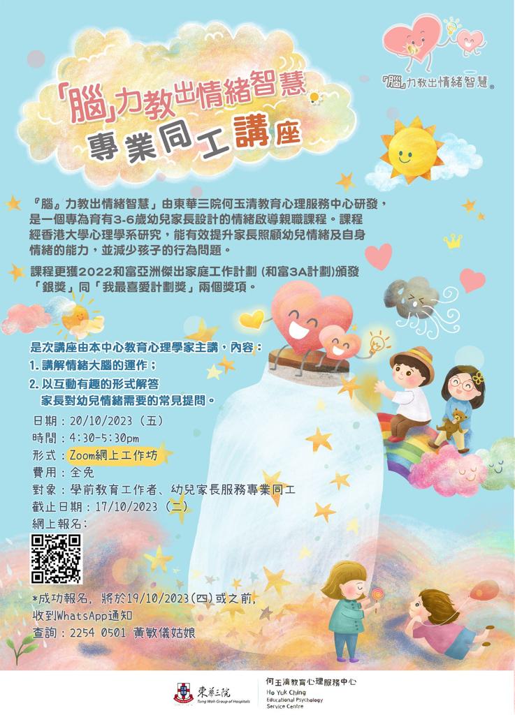 「『腦』力教出情緒智慧」由東華三院何玉清教育心理服務中心研發,是一個專為育有3-6歲幼兒家長設計的情緒啟導親職課程。課程經香港大學心理學系研究,能有效提升家長照顧幼兒情緒及自身情緒的能力,並減少孩子的行為問題。課程更獲2022和富亞洲傑出家庭工作計劃 (和富3A計劃)頒發「銀獎」同「我最喜愛計劃獎」兩個獎項。