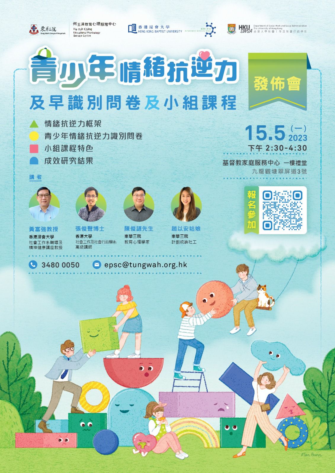 東華三院何玉清教育心理服務中心於2022/2023學年期間聯同香港浸會大學社會工作系黃富強教授香港大學社會工作及社會行政學系張俊聲博士於七間中學試行「青少年情緒抗逆力計劃」,合作研發一套適用於本地初中學生的「青少年情緒抗逆力」及早識別問卷及小組介入課程。