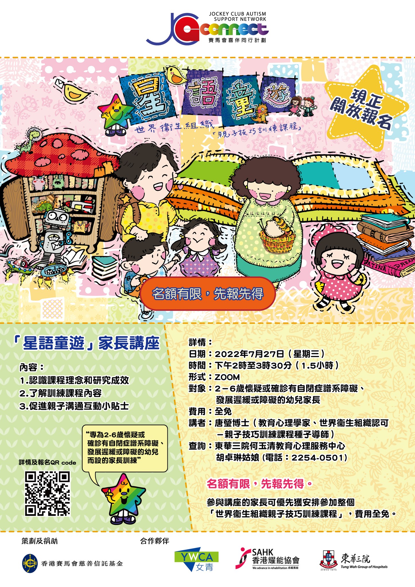 「星語童遊」親子技巧訓練課程是一個世界衞生組織認可嘅證書課程,專為2-6歲懷疑或確診有自閉症譜系障礙或發展遲緩的幼兒家長而設。