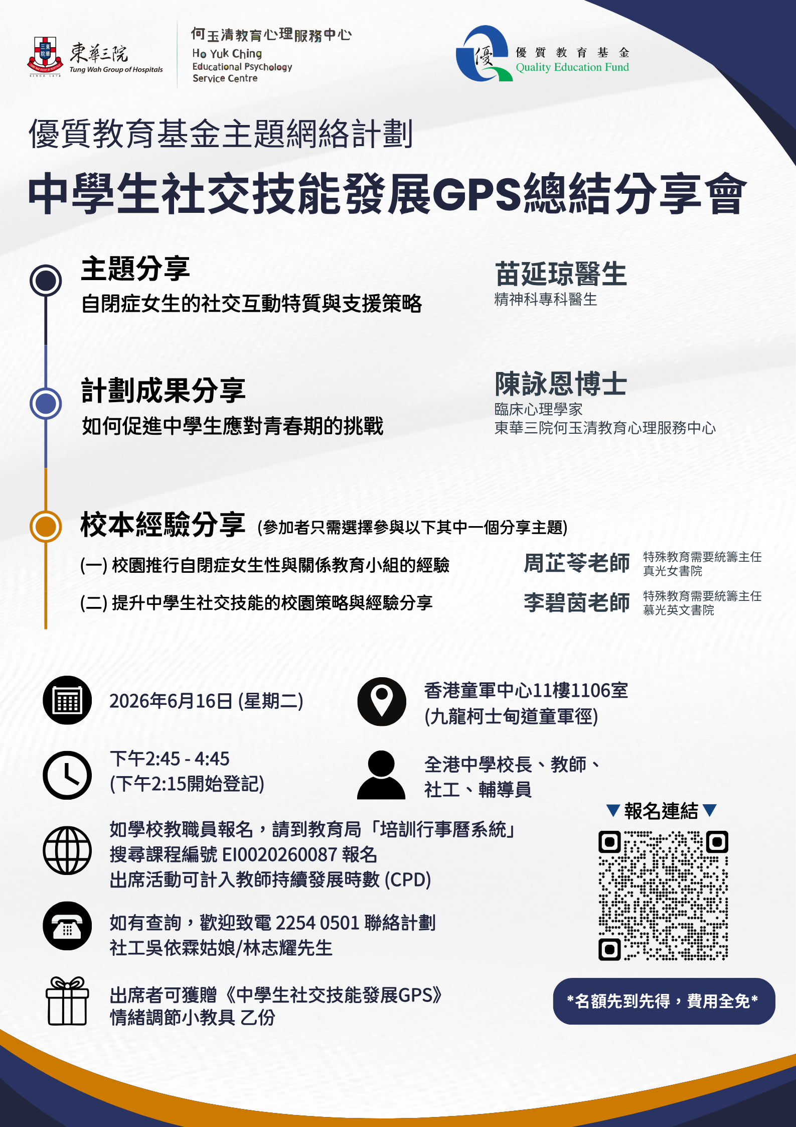 東華三院何玉清教育心理服務中心於 2022 年獲得優質教育基金資助,開展「中學生社交技能發展 GPS」計劃。