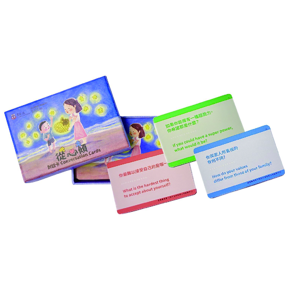 簡 介:《從心傾》卡牌是由臨床心理學家 Dr. Louise Hayes和心理學教授Dr. Joseph Ciarrochi 共同創作,並授權本中心進行繁體中文翻譯和設計。《從心傾》對話卡包括36張問句卡。透過有技巧的提問,協助青少年探索和認識自己,從而找到自己的方向。